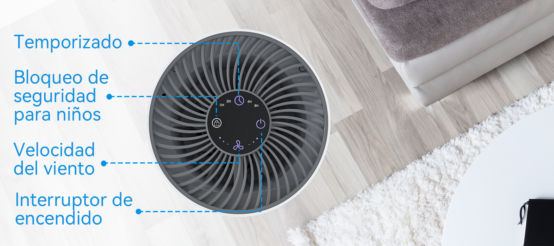 - Controles Inteligentes y Prácticos: Las velocidades del ventilador y el temporizador, fácilmente ajustables, simplifican su manejo.